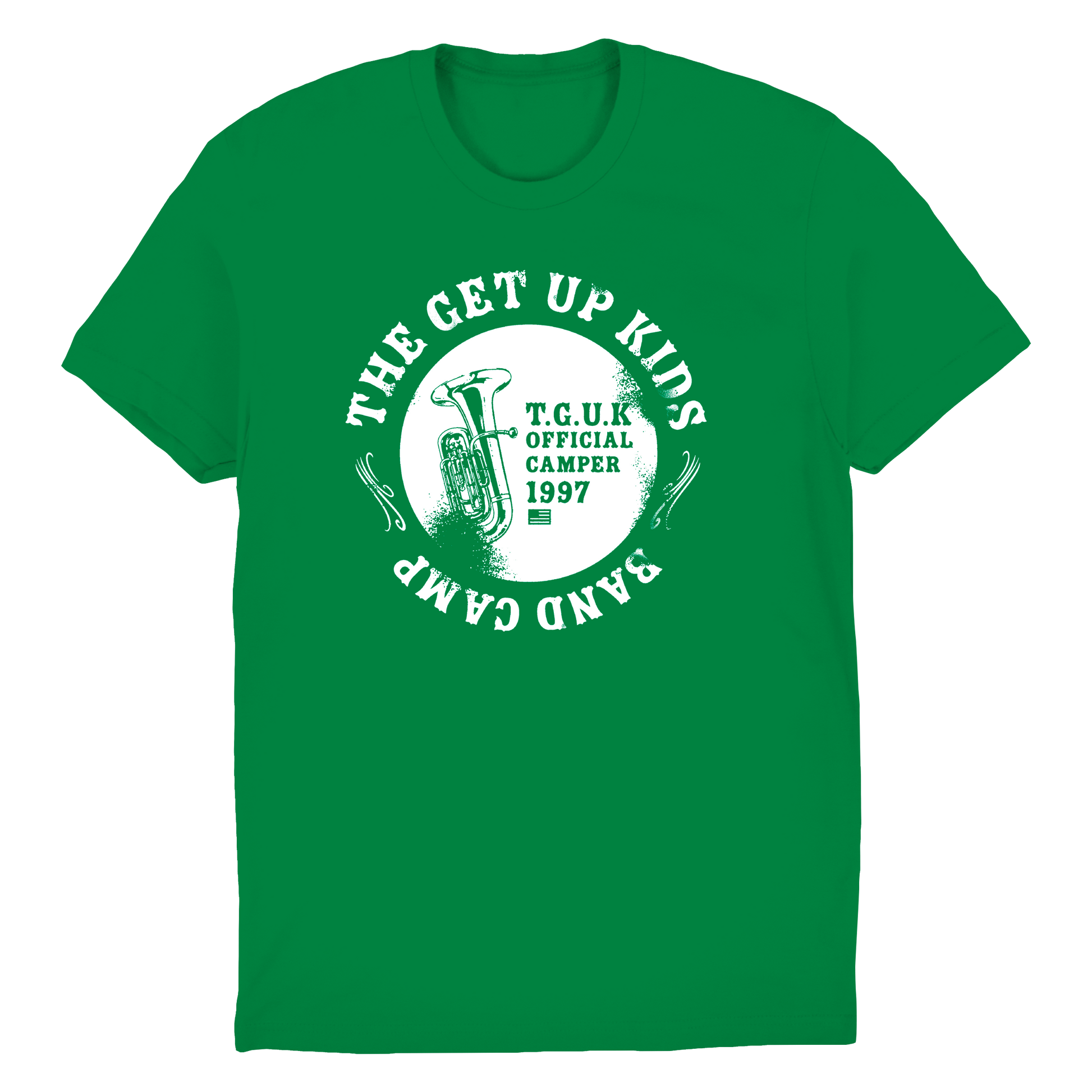 Classic one color band camp design on green ringspun cotton t-shirts. Mens/unisex sizing.