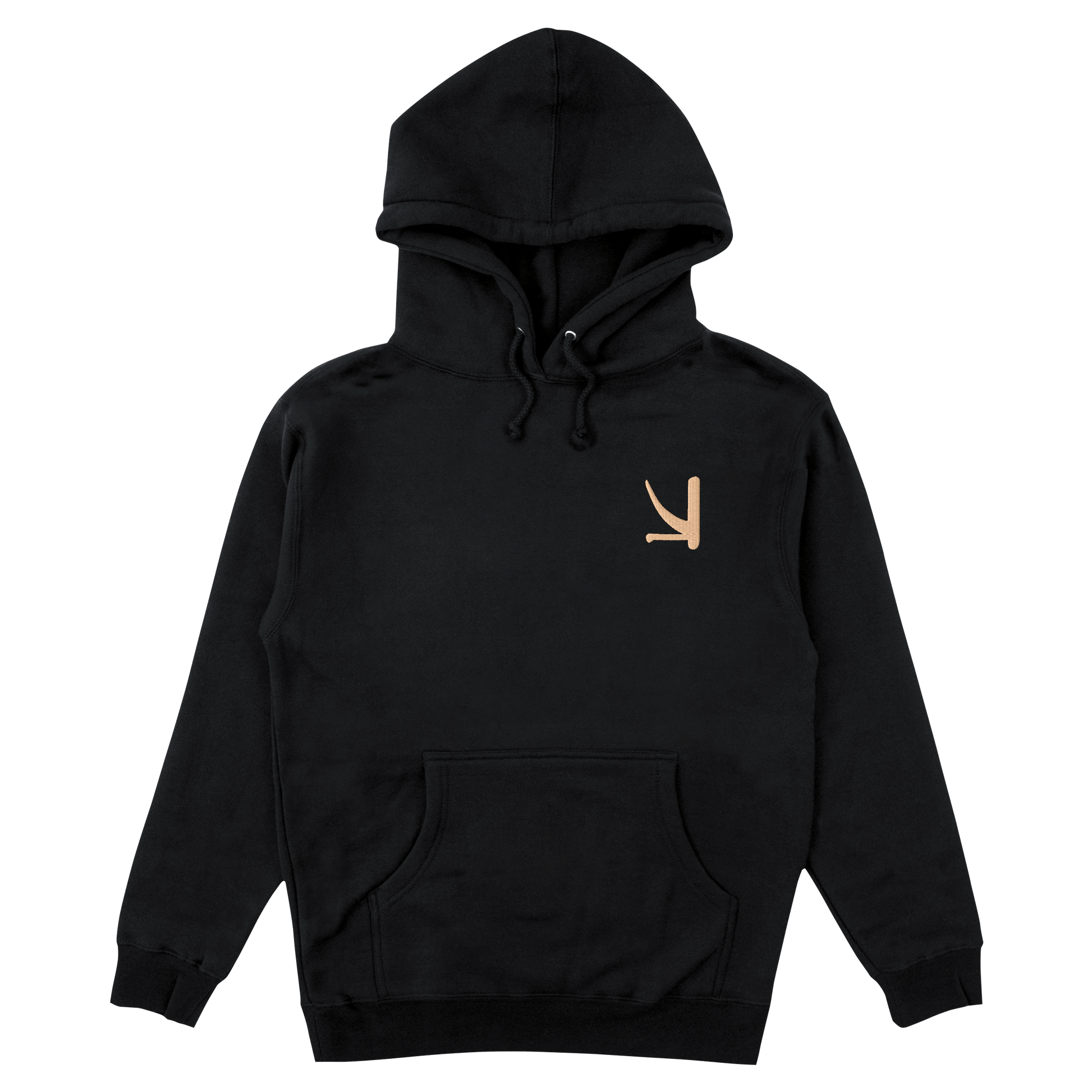 Black pullover hoodie with embroidered logo on front chest and full color back screenprint.